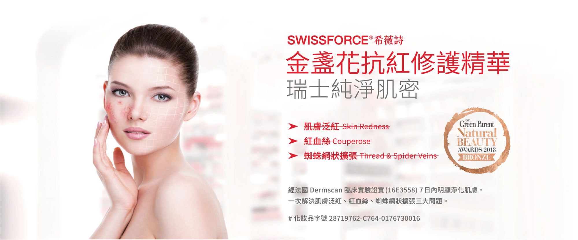 SwissForce 希薇詩 金盞花抗紅修護精華是針對肌膚泛紅、紅血絲、蜘蛛網狀擴張三大問題,經法國 Dermscan 臨床實驗證實(16E3558) 7 日內明顯淨化肌膚。
